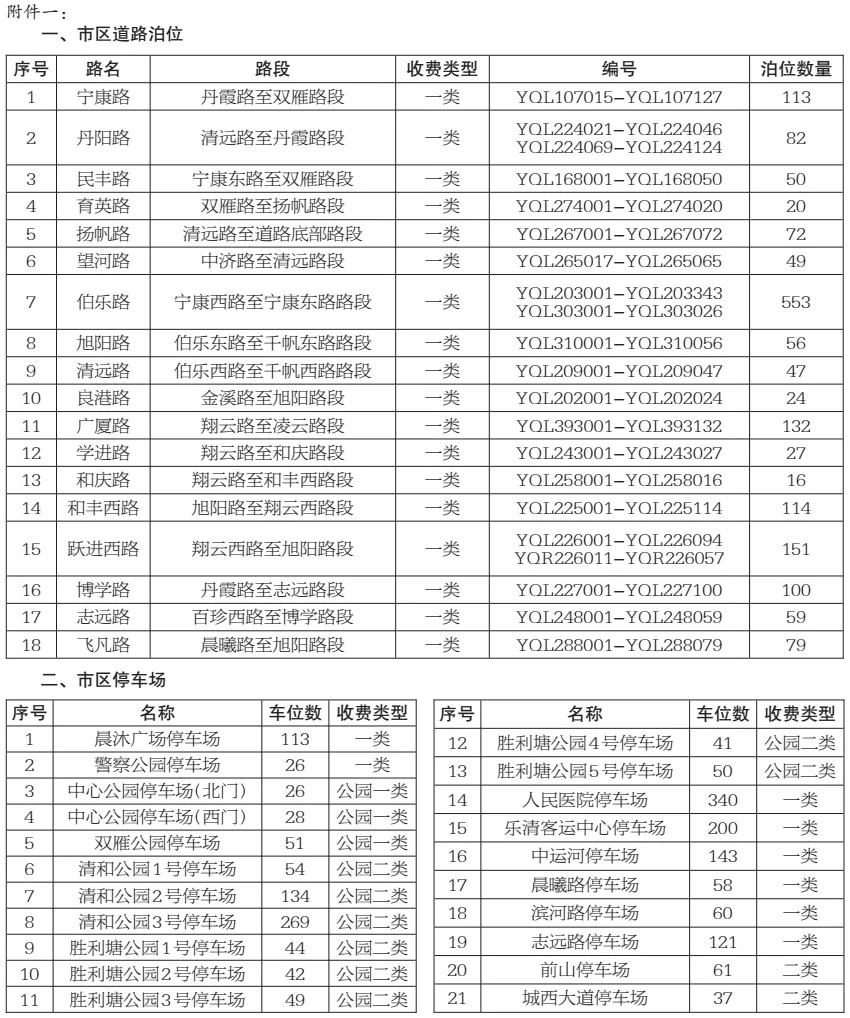 乐清市区18条道路1744个道路泊位和21个停车场(详见附件一)。