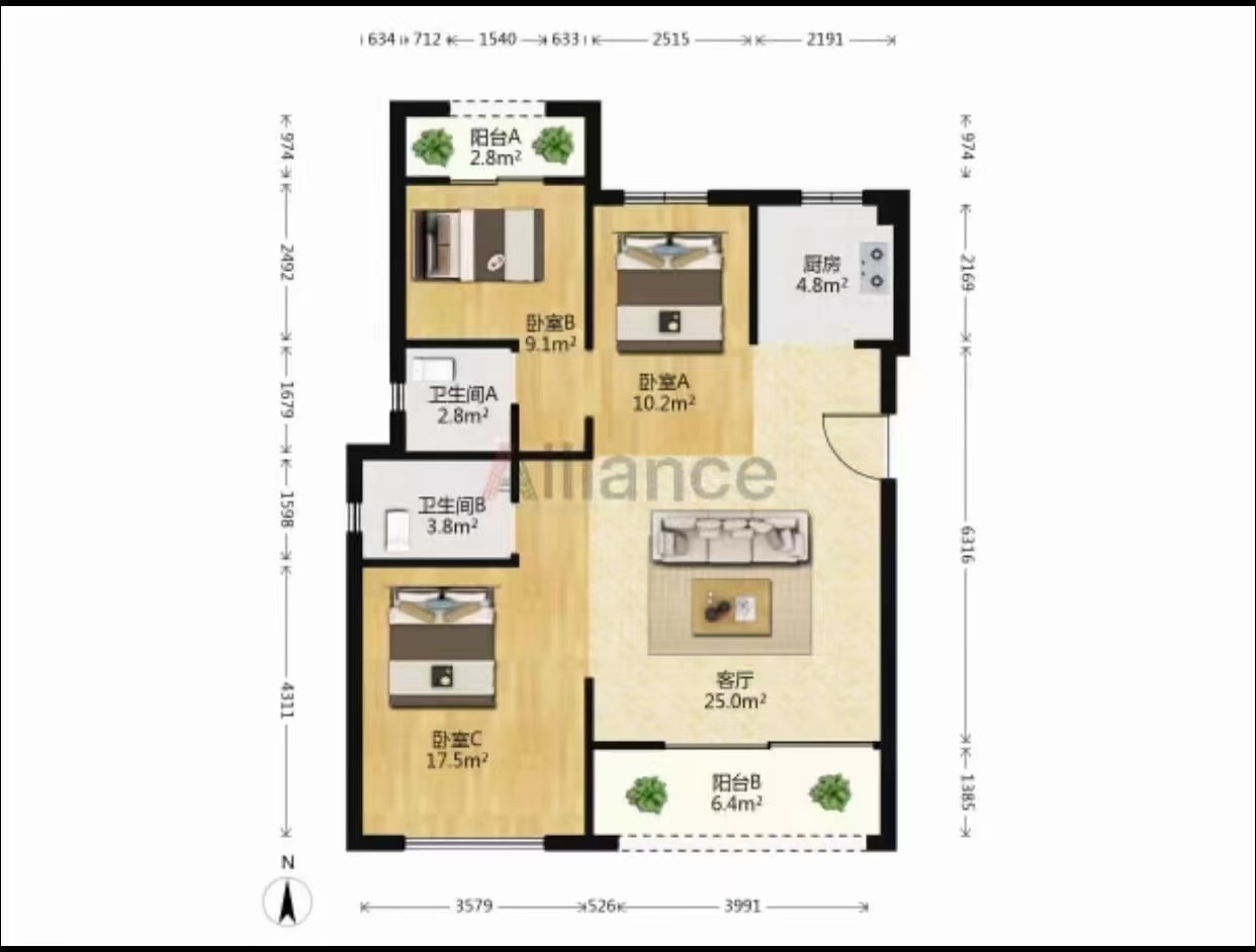 建筑面积103平三室两厅两卫 169万