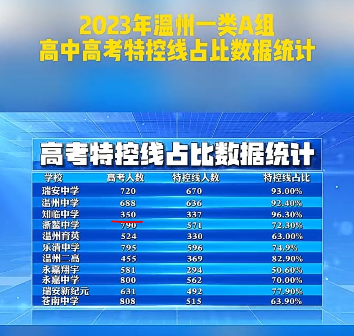 数据有相差很正常,成绩好能上知临的当然优先知临,成绩不够钱够的去嘉禾跟普通人有个屁关系。当乐中能达到瑞中的高度,去看看瑞中会怕浙鳌与新世元吗?关键是乐中二中自己要争气尤其是乐中,清北华五要看头部生源,特控线主要看管理,全乐清特控线1600左右,想想乐中的生源中有几个是低于1500的,特控线不要说90% 以上,至少要到80%才算正常吧。