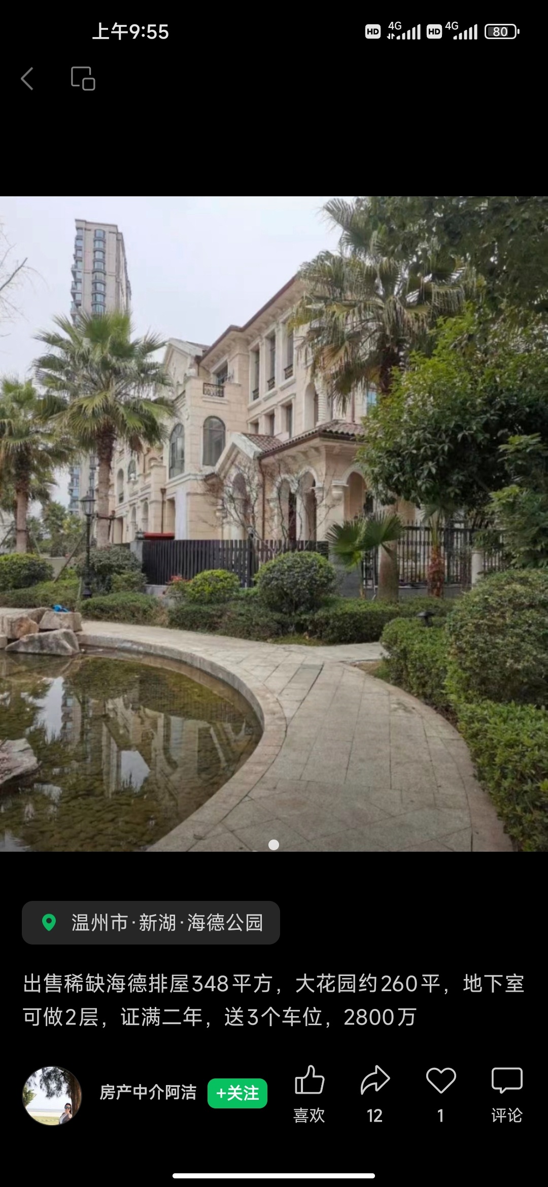 出售稀缺海德排屋建筑面积348平方,大花园约260平,地下室可做2层,证满二年,送3个车位,2800万13587787423