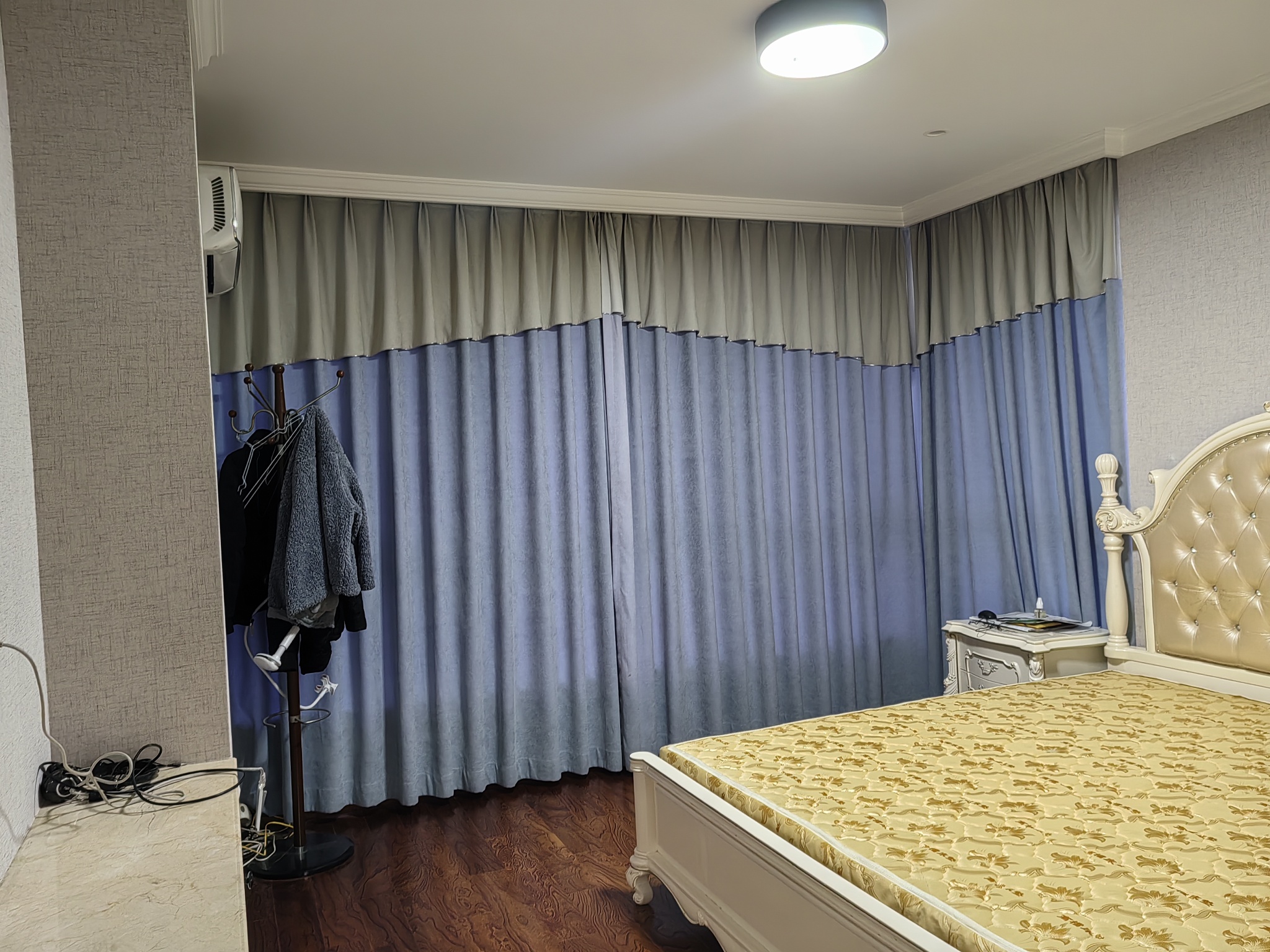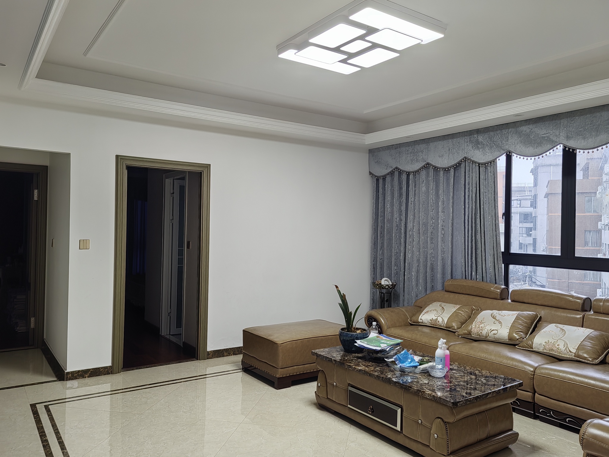 精装修三室二厅一厨二卫,套内配置冰箱.消毒柜.微波炉.洗衣机.净水器.电动晾衣架.电视机.餐桌.沙发等。