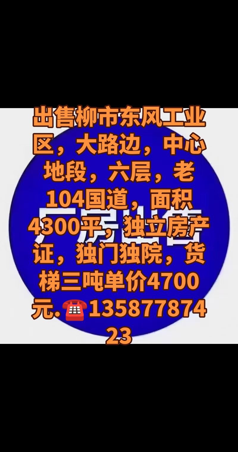 出售柳市东风工业区,大路边,中心地段,六层,老104国道,面积4300平,独立房产证,独门独院,货梯三吨单价4700元.13587787423