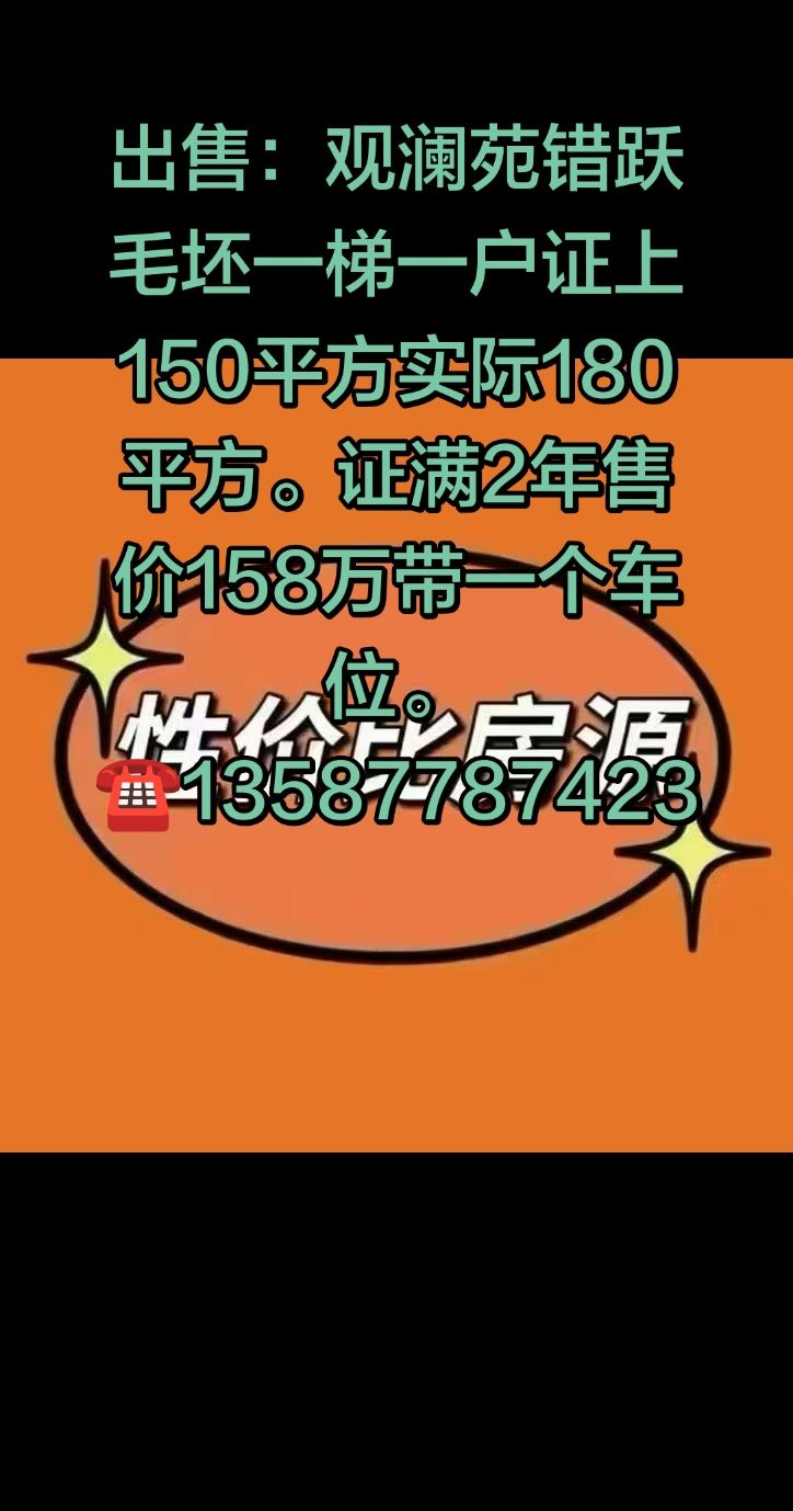 出售:观澜苑错跃毛坯一梯一户证上150平方实际180平方。证满2年售价158万带一个车位。