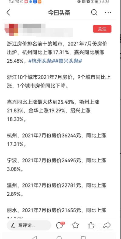 七月份浙江省城市商品房涨幅情况,自己看吧!温州垫底