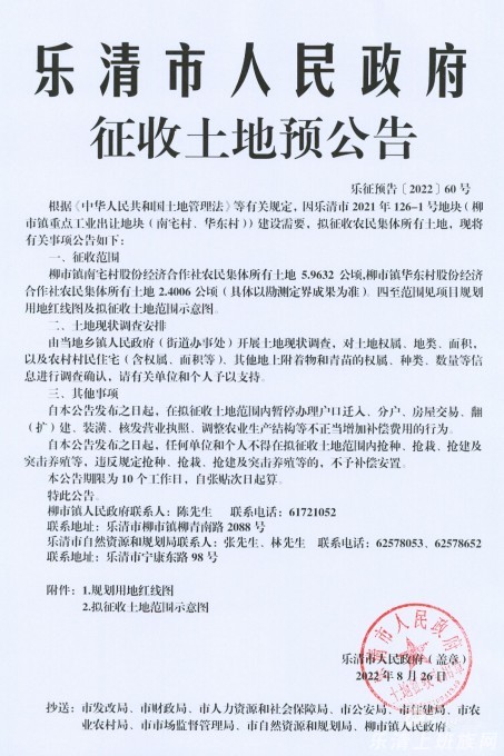 来自8月29日的乐清市人民政府征收土地预公告(乐征预告〔2022〕60号) 公告内容: 来源:乐清市人民政府网