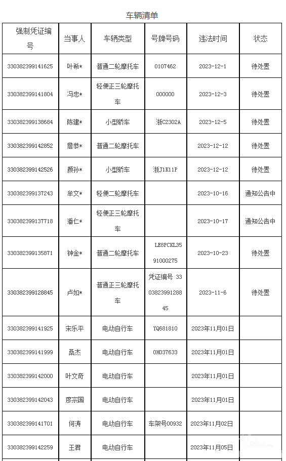 经核查,截至2023年12月29日,我局在日常交通管理中扣留超过30日尚未接受处理的机动车、非机动车共计155辆(清单见附件)。 请当事人自本公告发布之日起3个月内持相关手续到《公安交通管理行政强制措施凭证》上规定 ...