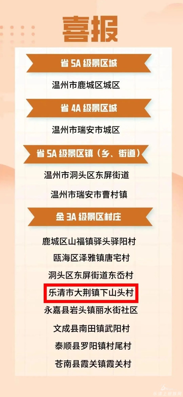日前,省文化和旅游厅、省农业农村厅联合发布了4A级以上景区城、5A级景区镇(乡、街道)和全省首批金3A级景区村庄名单,乐清上榜。 金3A级景区村庄是3A级景区村庄的升级版,对村庄的环境与景观、设施与要素、活动与 ...